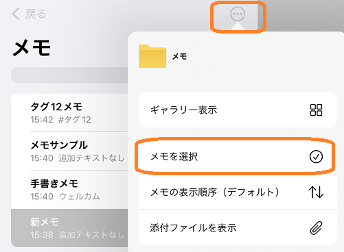 2.一覧の右上のメニューをタップして、メニュー「メモを選択」をタップします。
