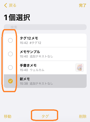 3.一覧からタグを付けたいメモにチェックを付け、画面下の中央の「タグ」をタップします。