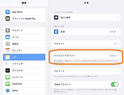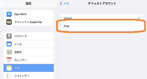 このままでもよいですが、メモを作成したときのデフォルトの保存先が、iPadになるように設定します。