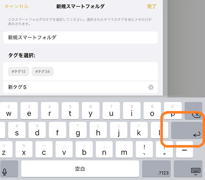5.タグの名前の入力後に、キーボードの右端の「エンターキー」をタップして、タグを追加します。