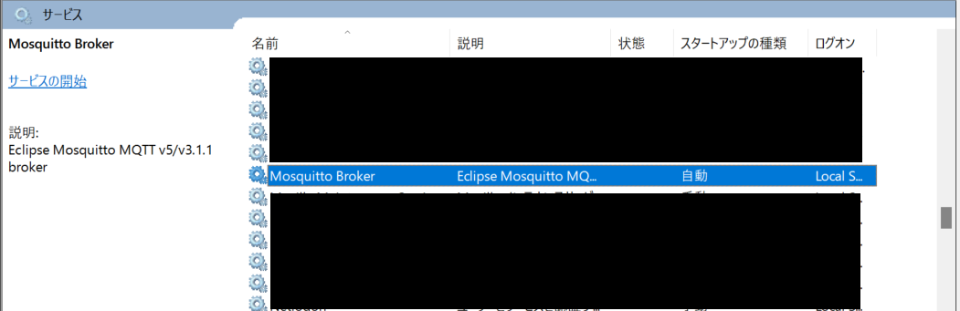 インストーラを使ったので、MQTTサーバはWindowsのサービス「Mosquitto Broker」として登録されています。